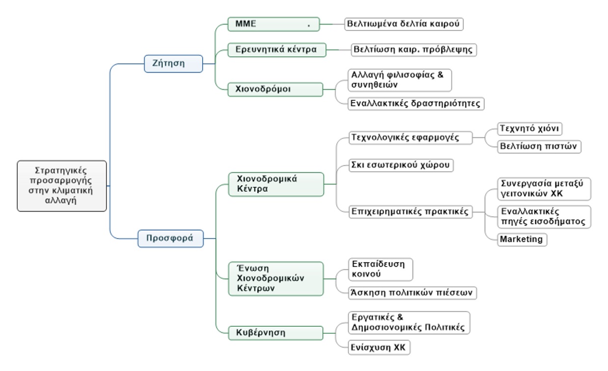 Ο χειμερινός τουρισμός είναι εξαιρετικά ευαίσθητος στην κλιματική αλλαγή και δίκαια χαρακτηρίζεται σαν το “καναρίνι στο ανθρακωρυχείο – the canary in the coalmine”, αφού είναι ο τομέας που πρώτος βιώνει τις δυσμενείς συνέπειες από την άνοδο της μέσης πλανητικής θερμοκρασίας. Η κλιματική αλλαγή είναι θανάσιμη απειλή για τα χιονοδρομικά κέντρα που βρίσκονται σε χαμηλά υψόμετρα ή μικρά γεωγραφικά πλάτη. Λόγω της γεωγραφικής θέσης της χώρας, τα Ελληνικά χιονοδρομικά ευρίσκονται σε μικρό γεωγραφικό πλάτος· επιπλέον οι μισές από τις πίστες τους εκτείνονται σε σχετικά χαμηλά υψόμετρα. Οι εμπλεκόμενοι στον κλάδο της χιονοδρομίας – χιονοδρομικά κέντρα, χιονοδρόμοι, πολιτεία, κλπ. – έχουν στη διάθεσή τους, καθένας στον τομέα ευθύνης του, και μια σειρά μέτρων για την αντιμετώπιση της κλιματικής αλλαγής (Σχήμα 1).