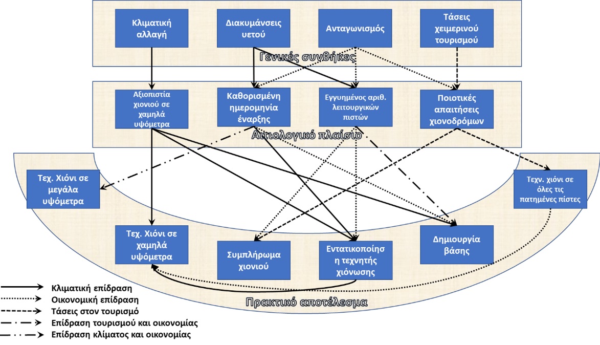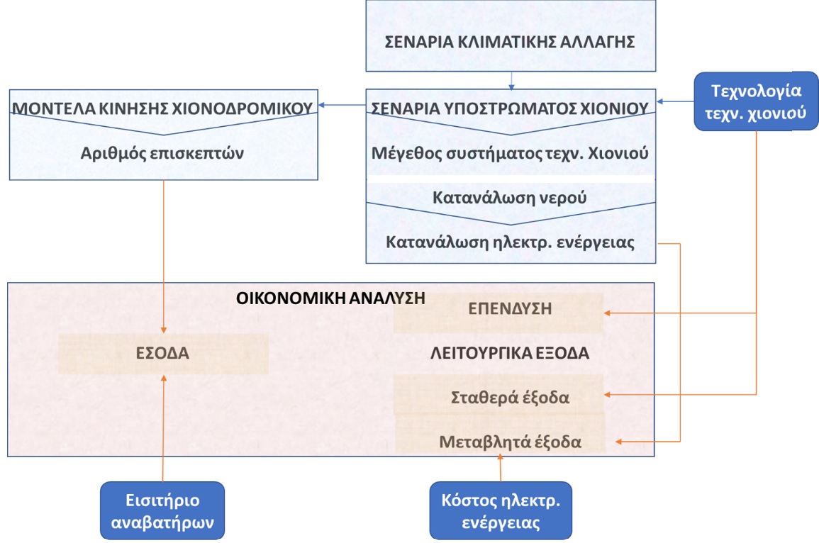 Μια επένδυση τεχνητού χιονιού προϋποθέτει ενδελεχή μελέτη των τοπογραφικών, κλιματικών, υδρολογικών και άλλων περιβαλλοντικών δεδομένων, καθώς και εκτίμηση της απόκρισης των πελατών – χιονοδρόμων – σε θέματα αλλαγής τιμών (ελαστικότητα τιμής). Στο Σχήμα 3 απεικονίζεται η αιτιώδης συνάφεια των αλληλοεμπλεκόμενων παραγόντων που συνδιαμορφώνουν τη βιωσιμότητα μιας επένδυσης τεχνητού χιονιού.Τα αποτελέσματα μοντέλων προσομοίωσης δείχνουν ότι τα χιονοδρομικά κέντρα διατρέχουν τον κίνδυνο σημαντικής αύξησης των λειτουργικών τους εξόδων λόγω αναμενόμενης αύξησης του κόστους ηλεκτρικής ενέργειας, παρόλο που οι ώρες λειτουργίας τεχνητού χιονιού θα βαίνουν μειούμενες. Ο αριθμός επισκεπτών αναμένεται μακροχρονίως μειούμενος λόγω σταδιακής ελάττωσης του βάθους χιονιού. Η έλλειψη χιονιού θα πλήξει δριμύτερα τα χιονοδρομικά κατά τη διάρκεια των εορτών των Χριστουγέννων. Η ανάλυση εσόδων – εξόδων δείχνει ότι, προκειμένου να εξασφαλιστεί η οικονομική βιωσιμότητα, η αύξηση της τιμής του εισιτηρίου είναι αναπόφευκτη.Γίνεται η παραδοχή ότι η κίνηση του χιονοδρομικού είναι γενικά ανελαστική ως προς την τιμή του εισιτηρίου. Η προσομοίωση δείχνει ότι αν η ζήτηση επηρεάζεται από την τιμή του εισιτηρίου πάνω από ένα βαθμό, τότε καμία τιμολογιακή αναπροσαρμογή δεν θα είναι ικανή να σώσει την καταρρέουσα κερδοφορία του χιονοδρομικού. Με άλλα λόγια, αν οι χιονοδρόμοι δεν αντιδράσουν υποστηρικτικά, το παιγνίδι για τα χιονοδρομικά είναι χαμένο! Ο κλάδος του χειμερινού τουρισμού αντιμετωπίζει πάντα την πρόκληση να προσφέρει στην πελατεία του διέξοδα εξίσου δελεαστικά με το σκι, όπως είναι ο περιβαλλοντικός, κοινωνικός, πολιτιστικός τουρισμός, ο τουρισμός ευεξίας (ιατρικός, ιαματικός), περιπατητικές περιηγήσεις (winter hiking), καθώς και να προσελκύσει χιονοδρόμους εκτός σεζόν, στοχεύοντας ειδικές ομάδες όπως ζευγάρια χωρίς παιδιά, μοναχικούς καβαλάρηδες και συνταξιούχους!